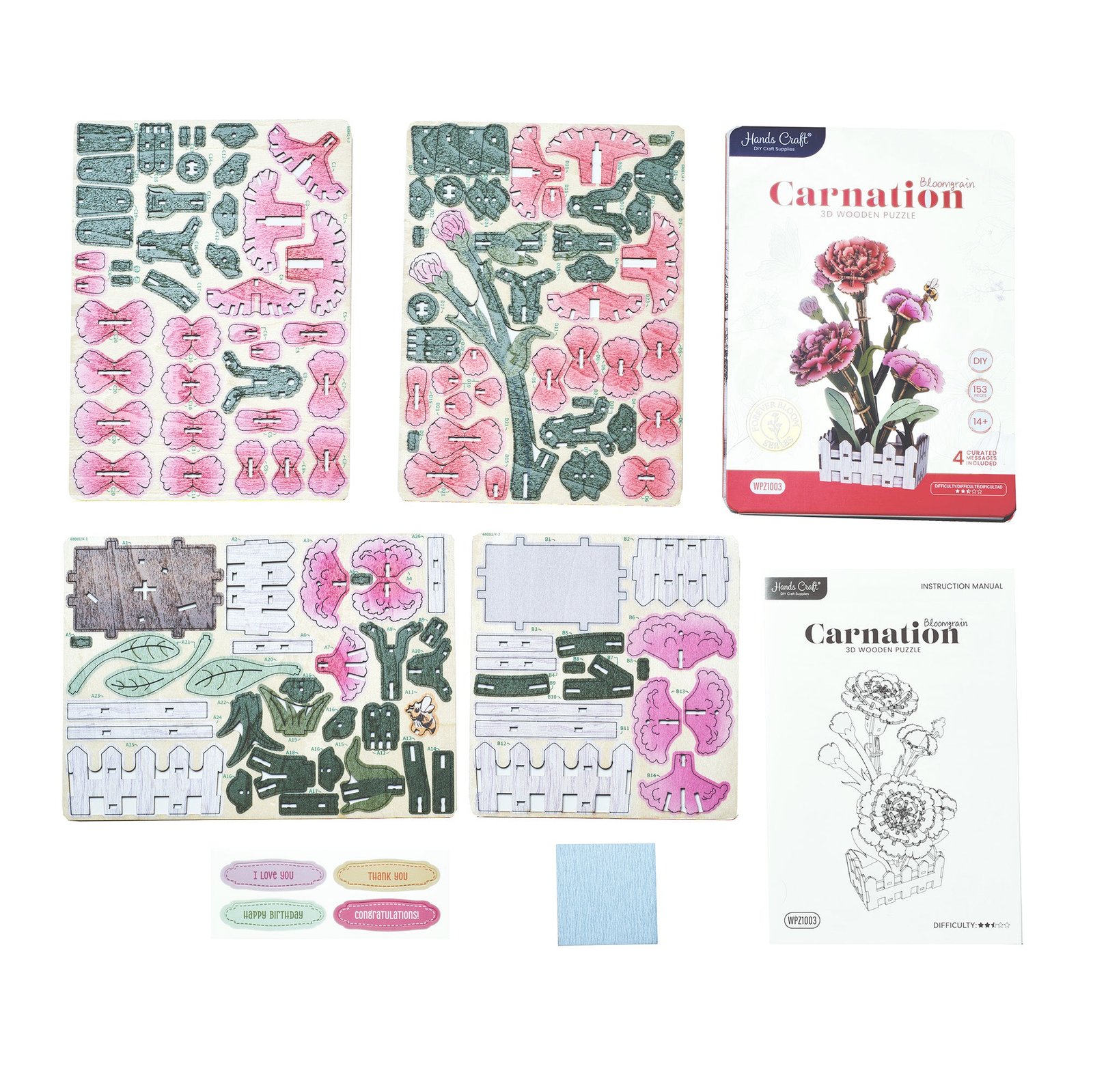 Create a beautiful carnation with this DIY miniature wooden puzzle. Designed to capture the carnation’s signature ruffled petals and full, layered bloom, this set brings depth and charm to a small-scale floral display. Each precision-cut wooden piece fits together smoothly without glue or tools, making assembly relaxing and enjoyable.