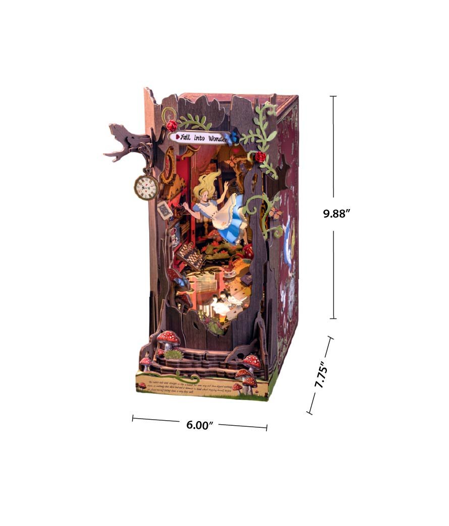 Step into the pages of a beloved classic with this DIY miniature book nook kit, a magical tribute to curiosity, whimsy, and wonder. As you build, watch Alice tumble gracefully down the rabbit hole, surrounded by a swirling flurry of falling treasures-chessboards, teacups mid-pour, curious cupboards, and floating saucers-all frozen in that dreamy descent.