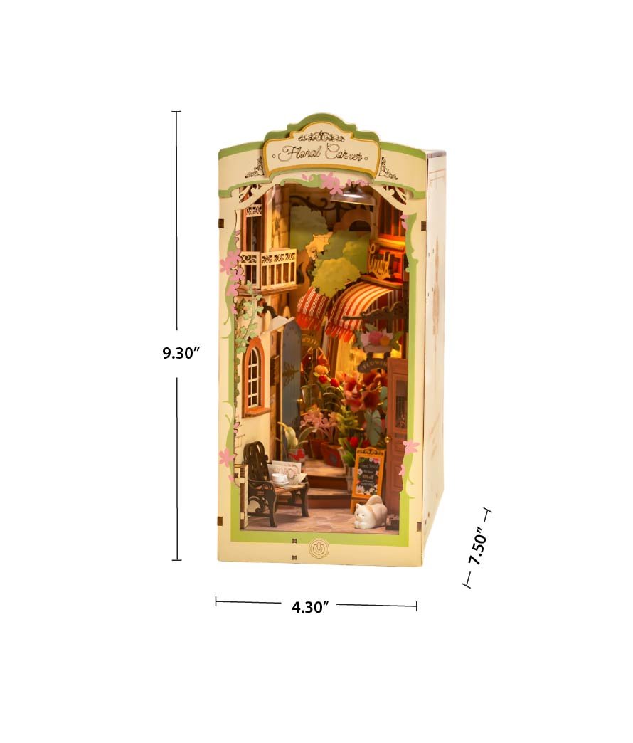 This book nook kit features flower shops, each brimming with vibrant blooms, hanging baskets, and window displays bursting with color. Cobblestone paths and charming storefronts create an inviting atmosphere, perfect for adding a touch of nature’s beauty to your bookshelf. With intricate details like shop signs, potted plants, and delicate floral arrangements, this kit captures the essence of a peaceful, hidden street where flowers are always in full bloom. Complete with soft lighting, it transforms your shelf into a serene escape.