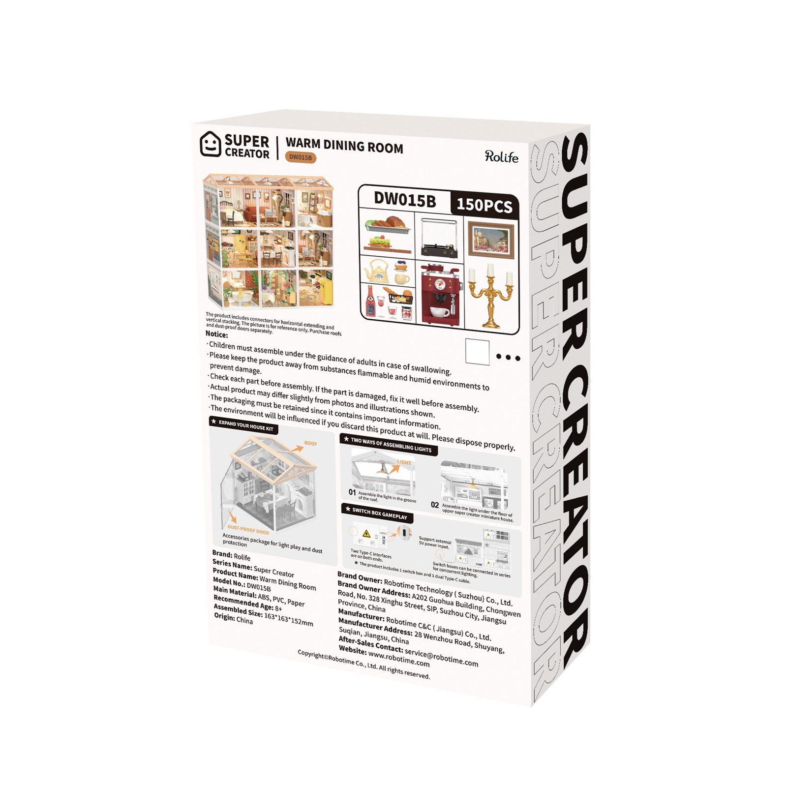 Step into a cozy, inviting space with this DIY miniature dining room kit, designed to evoke warmth and charm in every detail. This set lets you create a delightful dining room featuring floral wallpaper, an elegant espresso machine for that perfect touch of morning comfort, and a vintage-style record player. There are cupboards that, you can imagine, are filled with carefully crafted kitchenware, while the dining table is set with delicious looking miniature food and wine, ready for a cozy meal with friends.