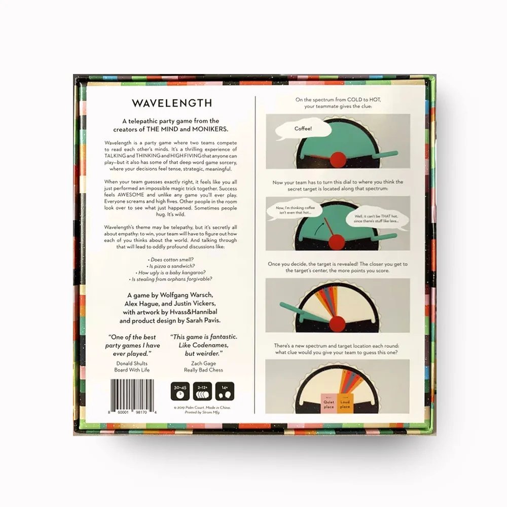Ideal for 2 to 12 players, ages 14 and up, Wavelength is perfect for parties, family game nights, and group gatherings. With 120 thought-provoking cards, a colorful game board, and easy-to-learn rules, it guarantees hours of lively social fun.